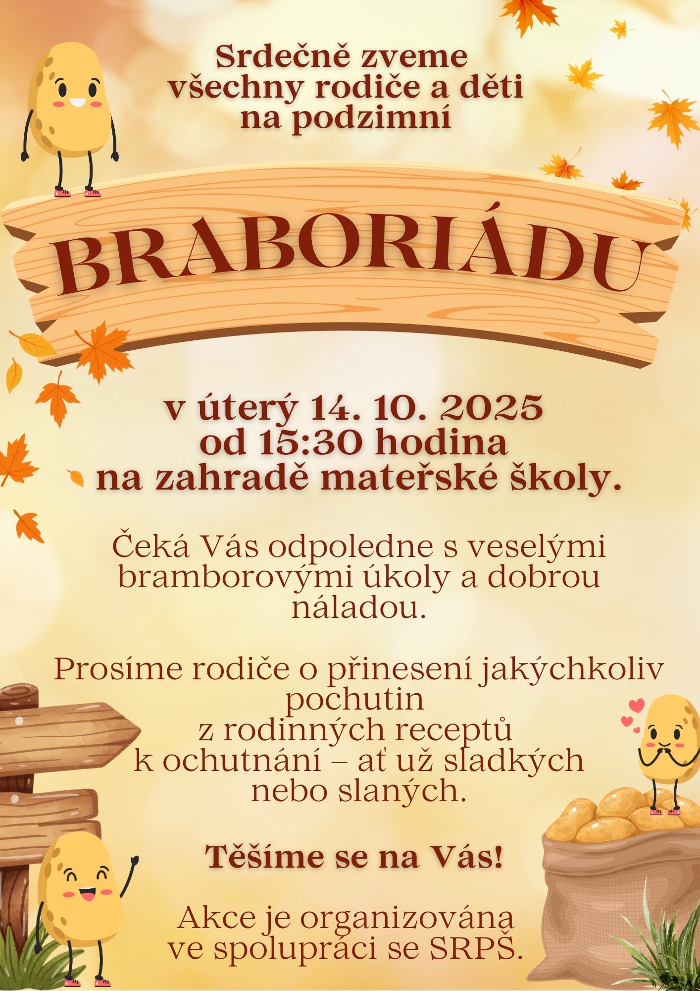Srdečně zveme všechny rodiče a děti na podzimní „BRAMBORIÁDU“, která se uskuteční v ÚTERÝ 14. 10. 2025 od 15:30 hodin na zahradě mateřské školy. Pokud by počasí opět nepřálo, uskutečníme akci v prostorách mateřské školy