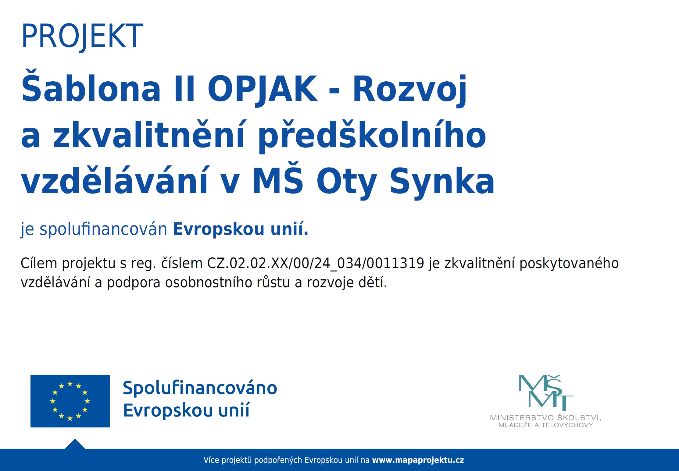 Projektem nás doprovází SOKOLÍK.Celý projekt je stavěn takt, aby umožnil zařazení projektu do aktivit, který v mateřských školách naplňuje Rámcový vzdělávací program pro předškolní vzdělávání. Pro děti jsou připraveny dětské deníky včetně samolepek, kterými si samostatně vedou přehled o splněných úkolech. Odměna na konci školního roku – diplomy pro jednotlivce i skupiny, drobné propagační předměty.