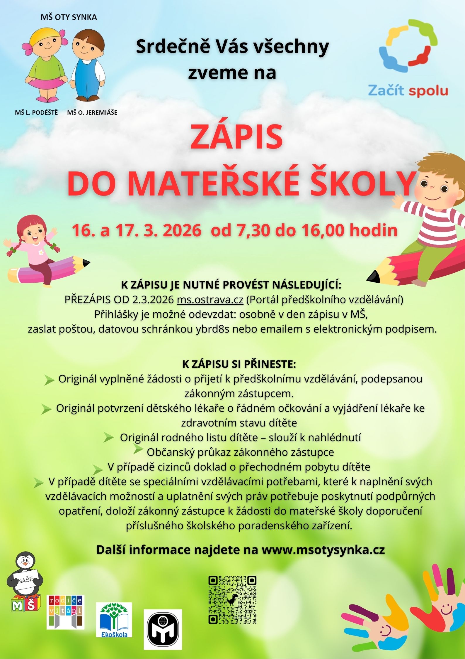 Statutární město Ostrava zřídilo pro všechny mateřské školy nový web Portál předškolního vzdělávání, který umožní zákonným zástupcům generování žádostí pro přijetí dítěte k předškolnímu vzdělávání. Generování žádostí je možno využít nejen pro řádný zápis na nový školní rok, ale pokud jsou volná místa i pro zápis v průběhu školního roku. Informaci o volných místech naleznete v sekci Katalog MŠ, kdy u názvu mateřské školy je piktogram, pokud mateřská škola disponuje volnými místy. Podrobné informace najdete na