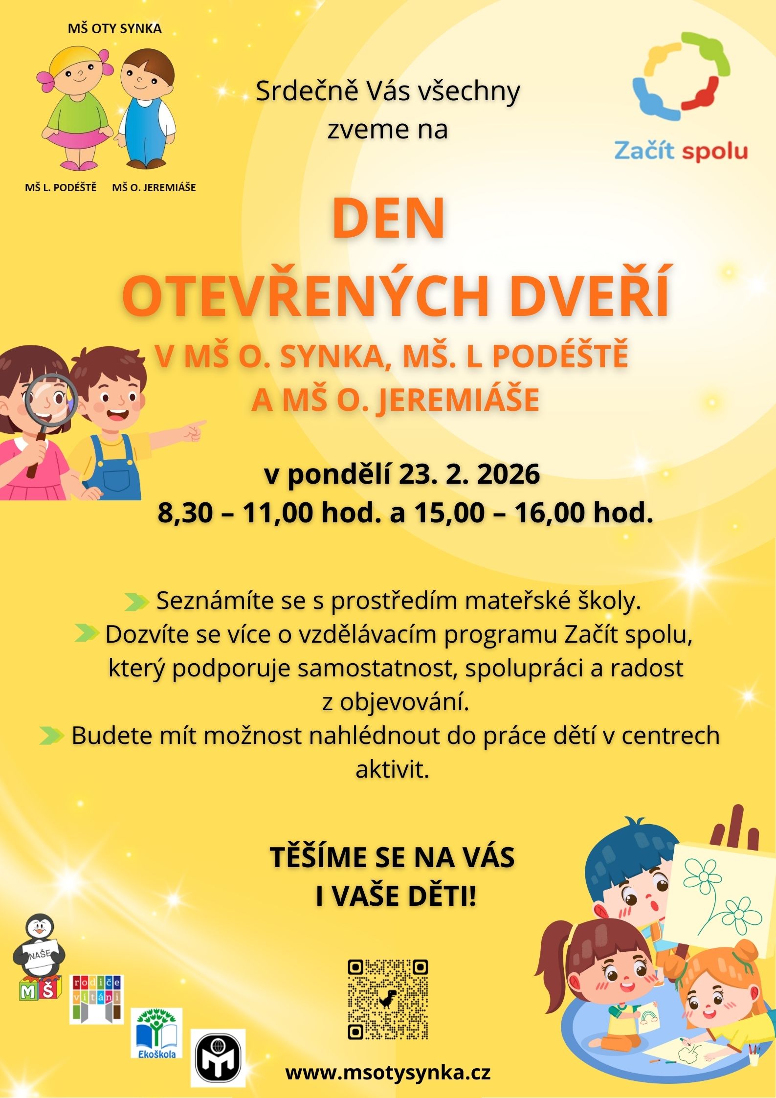 MŠ O. SYNKA 23. 2. 2026 v čase 8,30 – 11,00 hod. a 15,00 – 16,00 hod